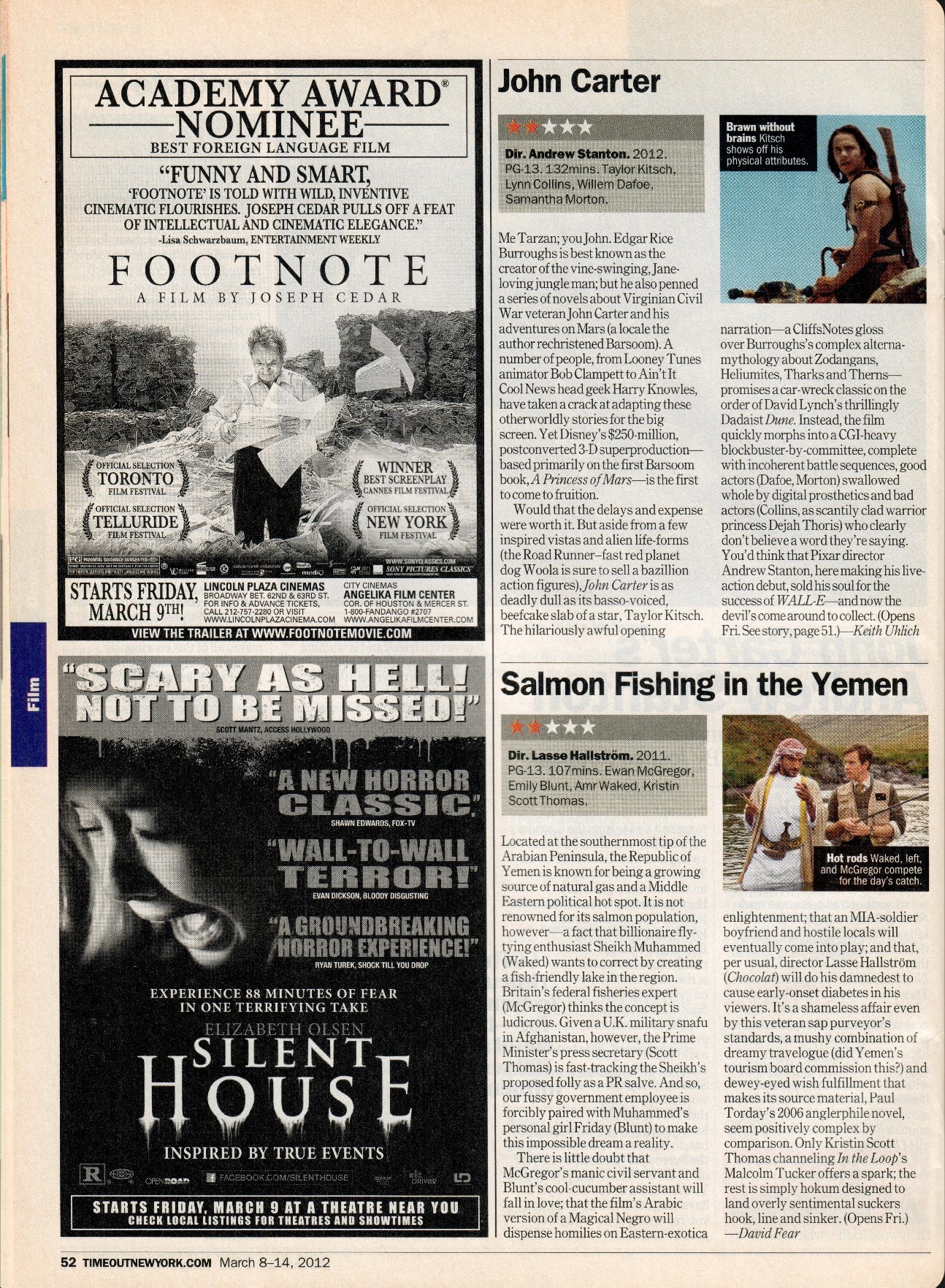 Would that the delays and expense were worth it. But aside from a few inspired vistas and alien life-forms (the Road Runner–fast red planet dog Woola is sure to sell a bazillion action figures), John Carter is as deadly dull as its basso-voiced, beefcake slab of a star, Taylor Kitsch. The hilariously awful opening narration — a CliffsNotes gloss over Burroughs’s complex alterna-mythology about Zodangans, Heliumites, Tharks and Therns — promises a car-wreck classic on the order of David Lynch’s thrillingly Dadaist Dune. Instead, the film quickly morphs into a CGI-heavy blockbuster-by-committee, complete with incoherent battle sequences, good actors (Dafoe, Morton) swallowed whole by digital prosthetics and bad actors (Collins, as scantily clad warrior princess Dejah Thoris) who clearly don’t believe a word they’re saying. You’d think that Pixar director Andrew Stanton, here making his live-action debut, sold his soul for the success of WALL-E — and now the devil’s come around to collect.—Keith Uhlich