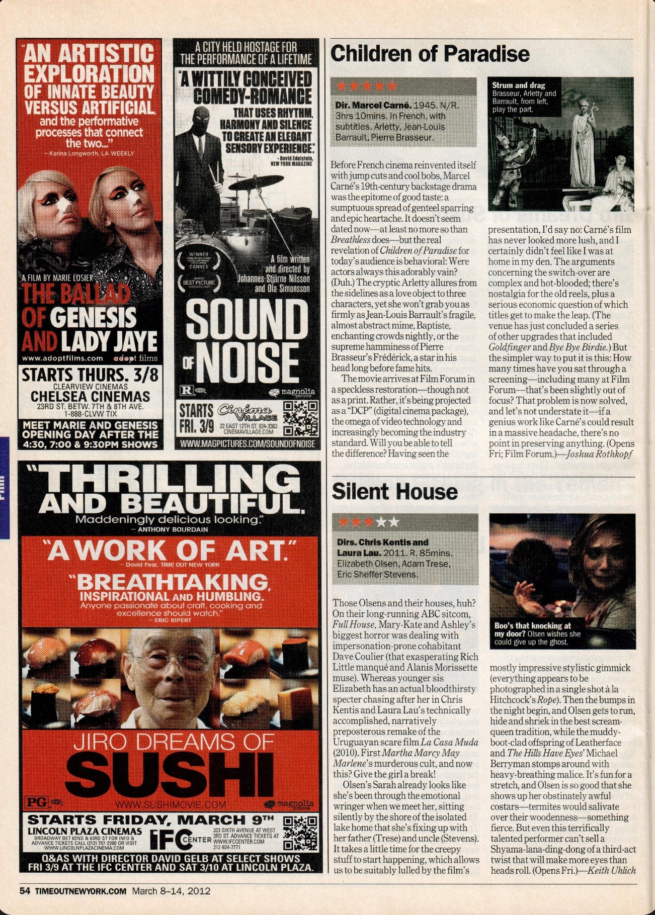 Olsen’s Sarah already looks like she’s been through the emotional wringer when we meet her, sitting silently by the shore of the isolated lake home that she’s fixing up with her father (Trese) and uncle (Stevens). It takes a little time for the creepy stuff to start happening, which allows us to be suitably lulled by the film’s mostly impressive stylistic gimmick (everything appears to be photographed in a single shot à la Hitchcock’s Rope). Then the bumps in the night begin, and Olsen gets to run, hide and shriek in the best scream-queen tradition, while the muddy-boot-clad offspring of Leatherface and The Hills Have Eyes’ Michael Berryman stomps around with heavy-breathing malice. It’s fun for a stretch, and Olsen is so good that she shows up her obstinately awful costars — termites would salivate over their woodenness — something fierce. But even this terrifically talented performer can’t sell a Shyama-lana-ding-dong of a third-act twist that will make more eyes than heads roll.—Keith Uhlich