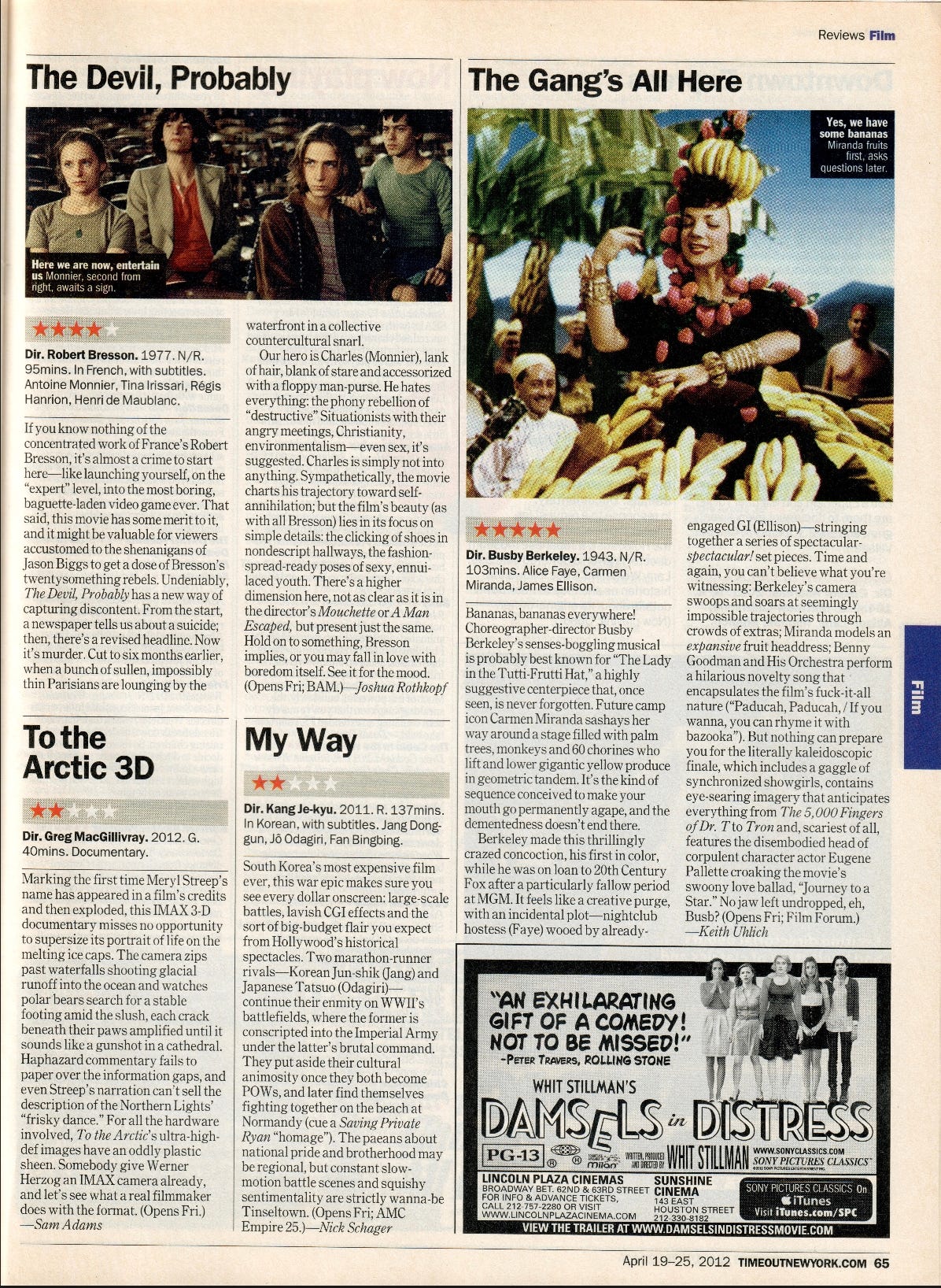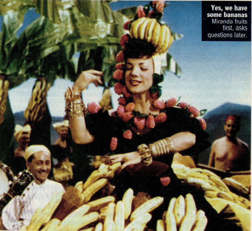 Bananas, bananas everywhere! Choreographer-director Busby Berkeley’s senses-boggling musical is probably best known for “The Lady in the Tutti-Frutti Hat,” a highly suggestive centerpiece that, once seen, is never forgotten. Future camp icon Carmen Miranda sashays her way around a stage filled with palm trees, monkeys and 60 chorines who lift and lower gigantic yellow produce in geometric tandem. It’s the kind of sequence conceived to make your mouth go permanently agape, and the dementedness doesn’t end there.