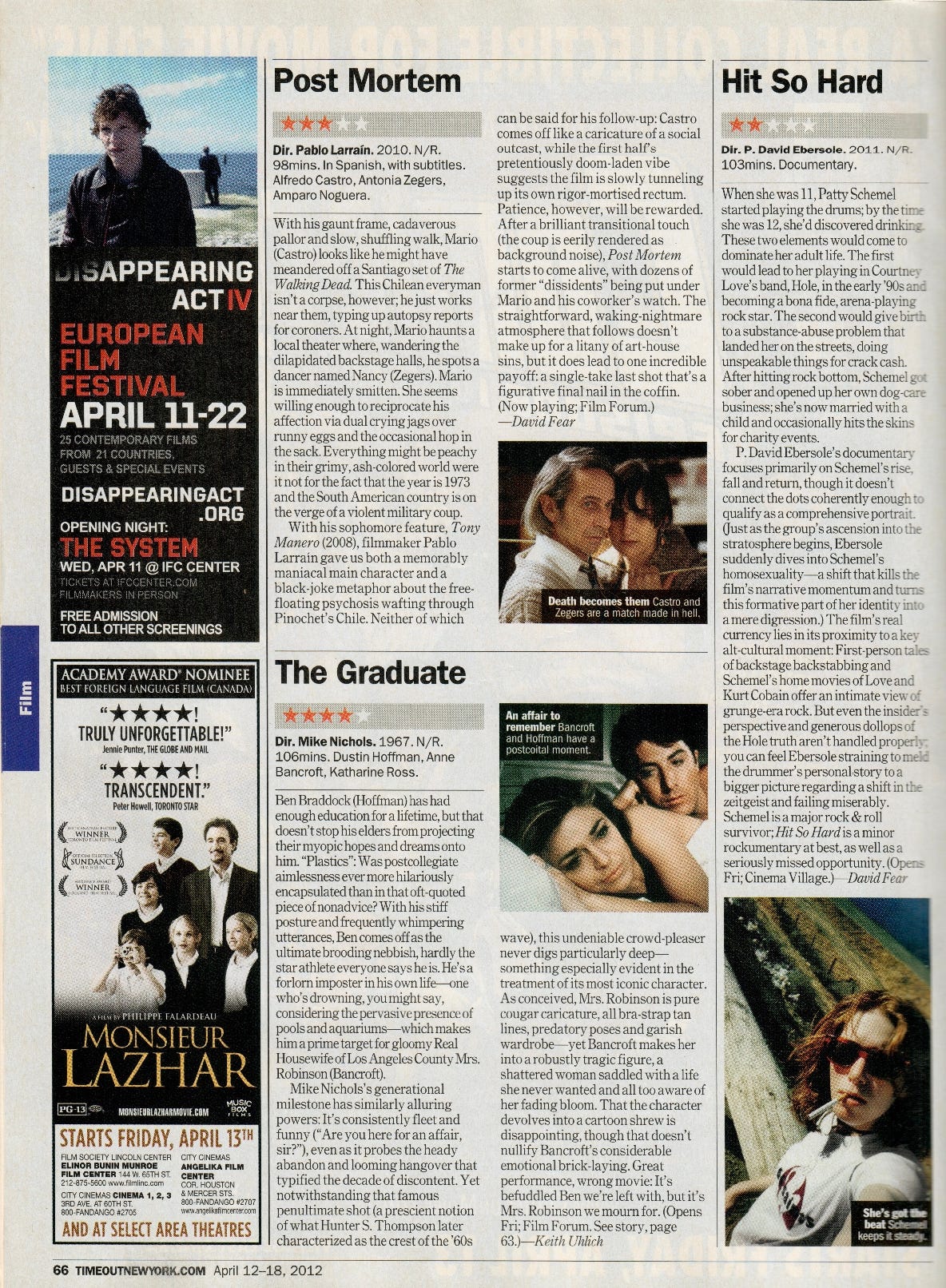 Mike Nichols’s generational milestone has similarly alluring powers: It’s consistently fleet and funny (“Are you here for an affair, sir?”), even as it probes the heady abandon and looming hangover that typified the decade of discontent. Yet notwithstanding that famous penultimate shot (a prescient notion of what Hunter S. Thompson later characterized as the crest of the ’60s wave), this undeniable crowd-pleaser never digs particularly deep — something especially evident in the treatment of its most iconic character. As conceived, Mrs. Robinson is pure cougar caricature, all bra-strap tan lines, predatory poses and garish wardrobe — yet Bancroft makes her into a robustly tragic figure, a shattered woman saddled with a life she never wanted and all too aware of her fading bloom. That the character devolves into a cartoon shrew is disappointing, though that doesn’t nullify Bancroft’s considerable emotional brick-laying. Great performance, wrong movie: It’s befuddled Ben we’re left with, but it’s Mrs. Robinson we mourn for.—Keith Uhlich