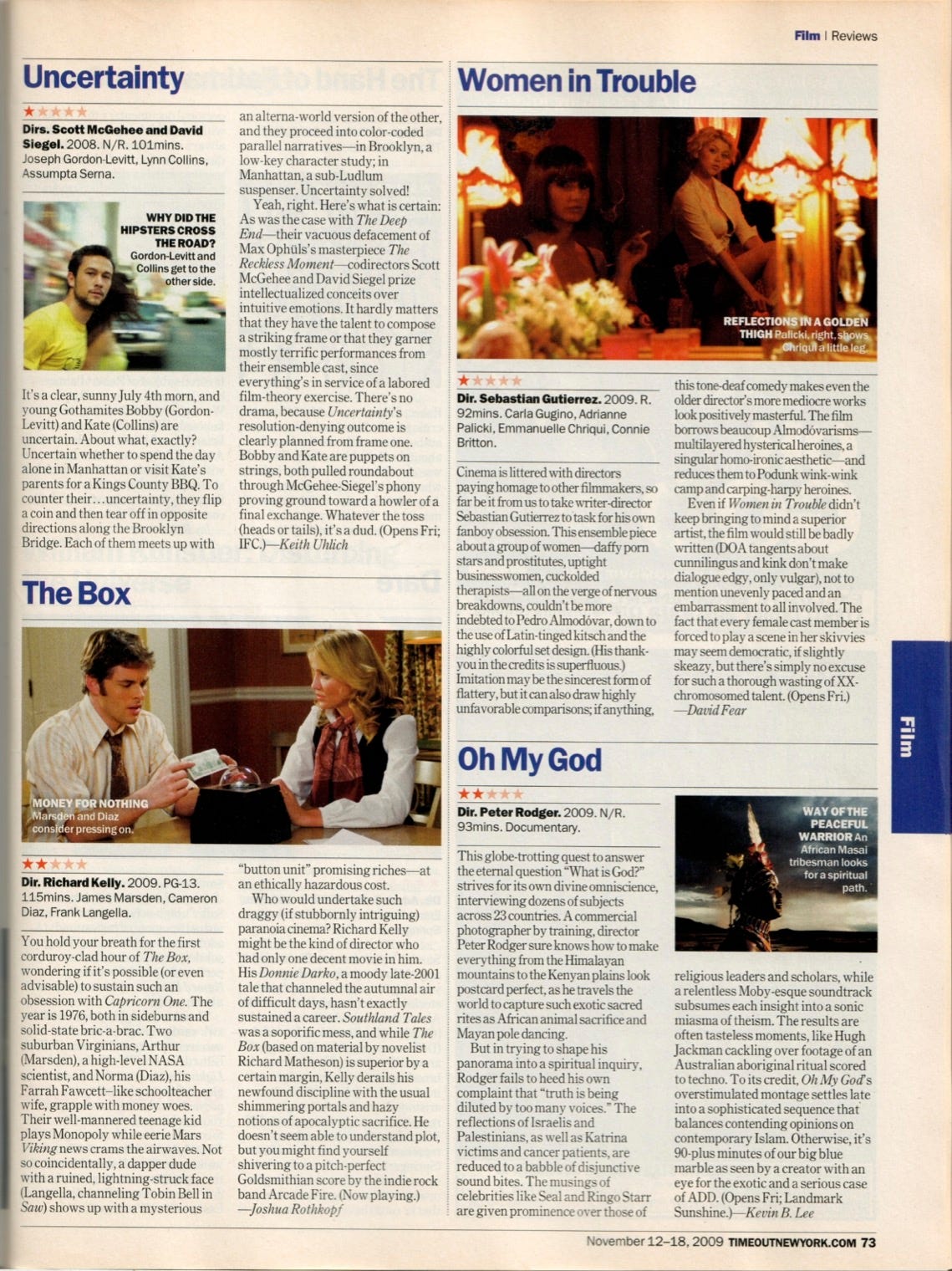 It’s a clear, sunny July 4th morn, and young Gothamites Bobby (Gordon-Levitt) and Kate (Collins) are uncertain. About what, exactly? Uncertain whether to spend the day alone in Manhattan or visit Kate’s parents for a Kings County BBQ. To counter their…uncertainty, they flip a coin and then tear off in opposite directions along the Brooklyn Bridge. Each of them meets up with an alterna-world version of the other, and they proceed into color-coded parallel narratives—in Brooklyn, a low-key character study; in Manhattan, a sub-Ludlum suspenser. Uncertainty solved!